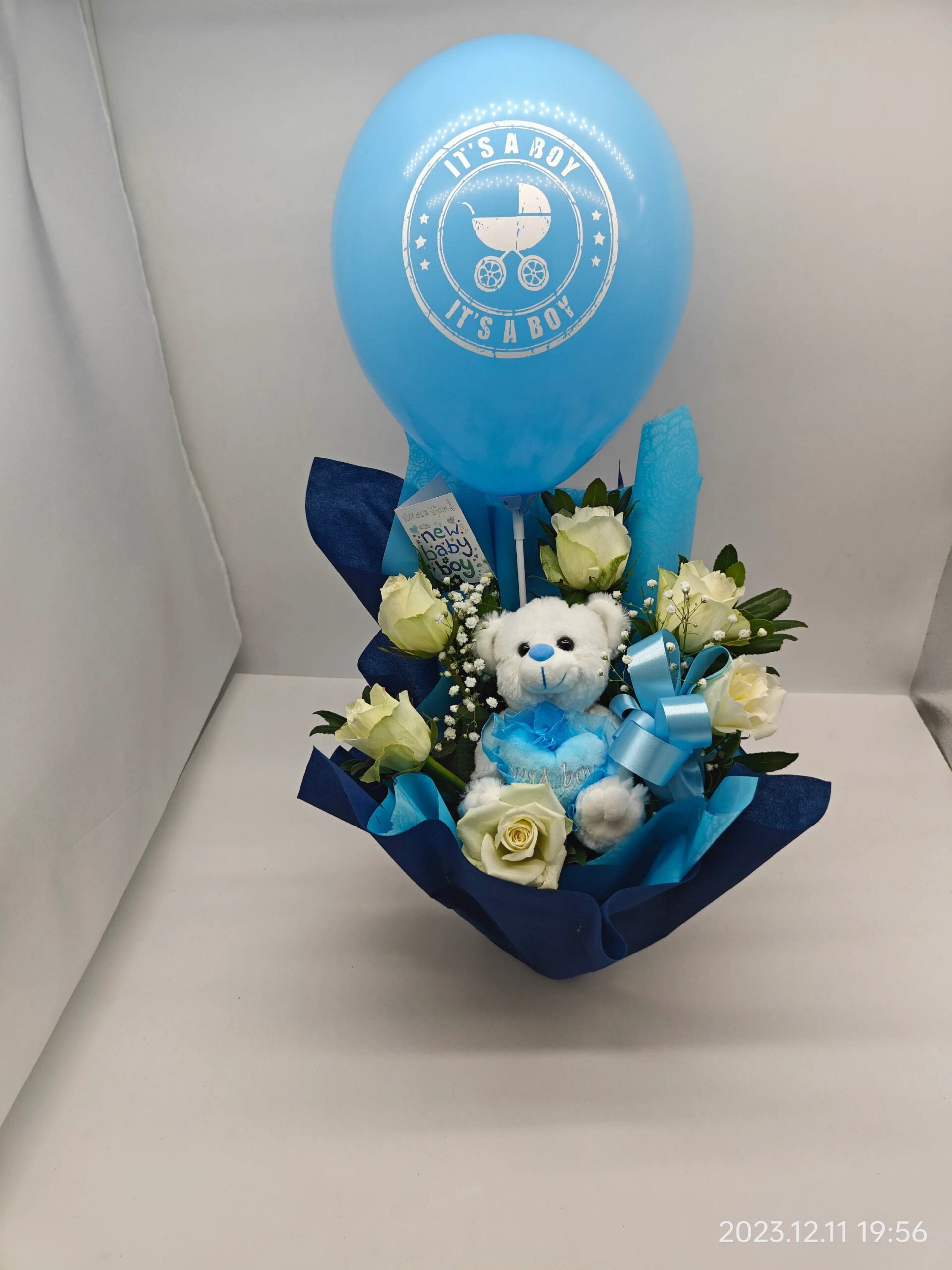 Καλωσορίστε ένα γλυκό νεογέννητο αγοράκι με την πανέμορφη σύνθεσή μας. Ανθοσύνθεση με υπέροχα τριαντάφυλλα, λούτρινο αρκουδάκι και γαλάζιο μπαλόνι.