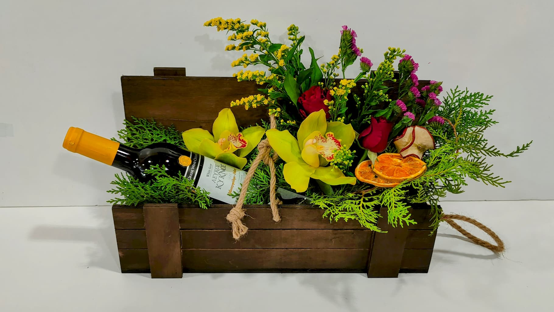 Το ανθοπωλείο μας σας προτείνει μια πολύ όμορφη σύνθεση με τριαντάφυλλα, ορχιδέες σιμπιντίουμ, σολιντάγκο και κρασί τοποθετημένα σε ένα ξύλινο μπαουλάκι. Ένα πολύ όμορφο γιορτινό αλλά και επαγγελματικό δώρο.