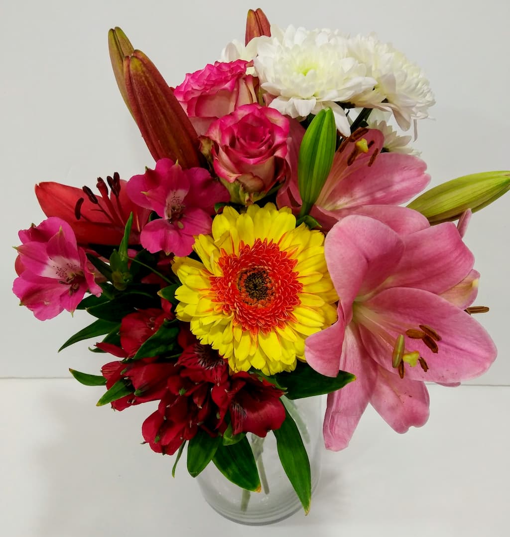 Το ανθοπωλείο μας σας προτείνει ένα μπουκέτο με ολόφρεσκα λίλιουμ, τριαντάφυλλά, αστρομέριες, ζέρμπερες και χρυσάνθεμα.