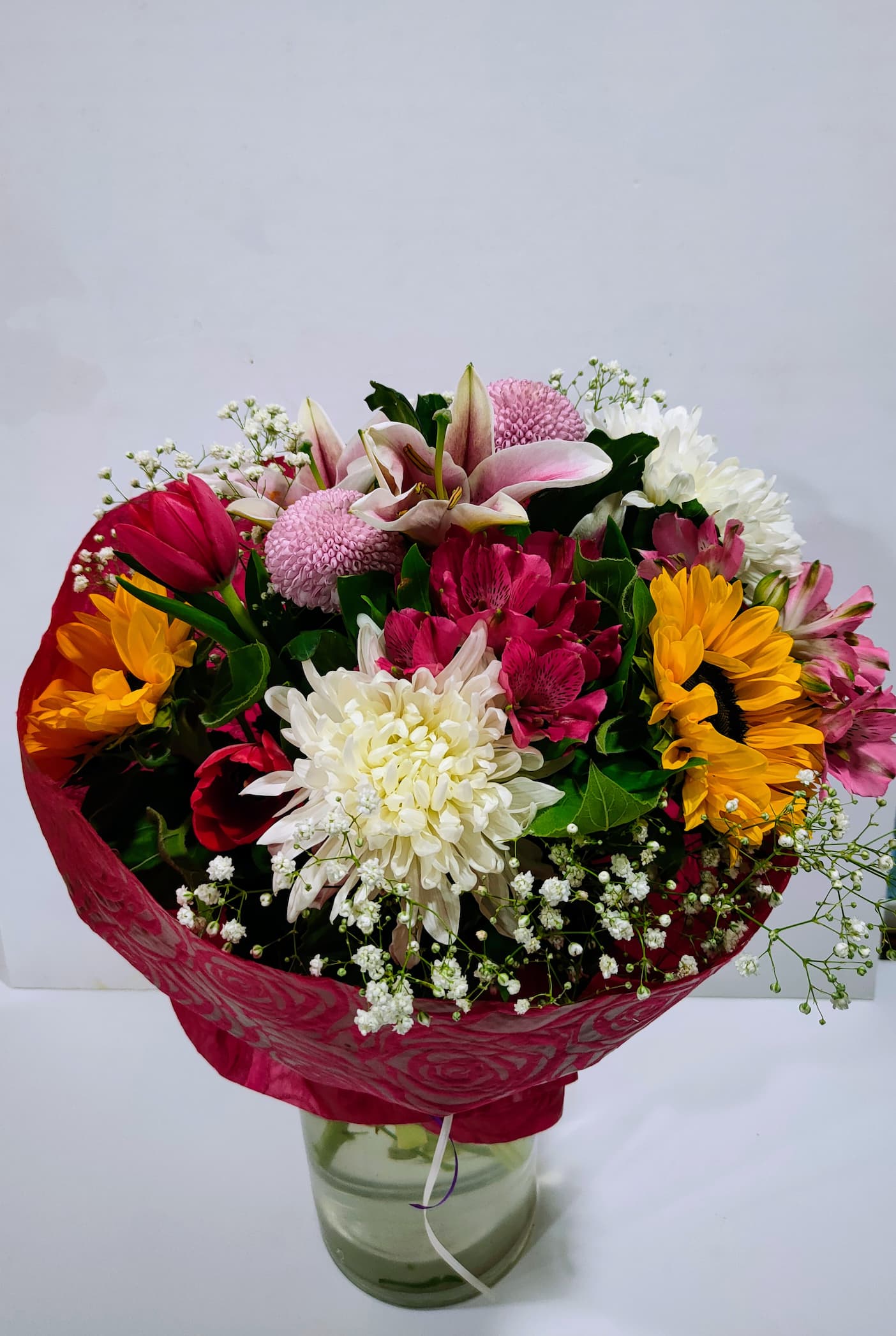 Το ανθοπωλείο μας σας προτείνει ένα υπέροχο μπουκέτο φρέσκων λουλουδιών γεμάτο χρώμα με ηλιοτρόπια, λίλιουμ οριεντάλ, αλστρομέριες και κεφαλάτα λευκά χρυσάνθεμα.