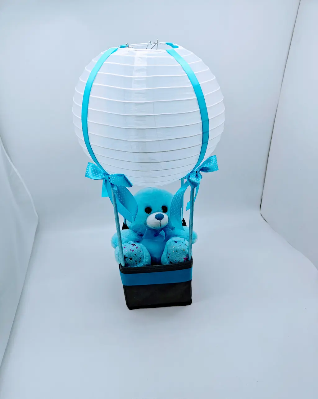 Χειροποίητο φωτιστικό αερόστατο 55cm γαλάζιο για το παιδικό δωμάτιο με λούτρινο ζωάκι για να φωτίσει και να διακομίσει το δωμάτιο του μικρού.