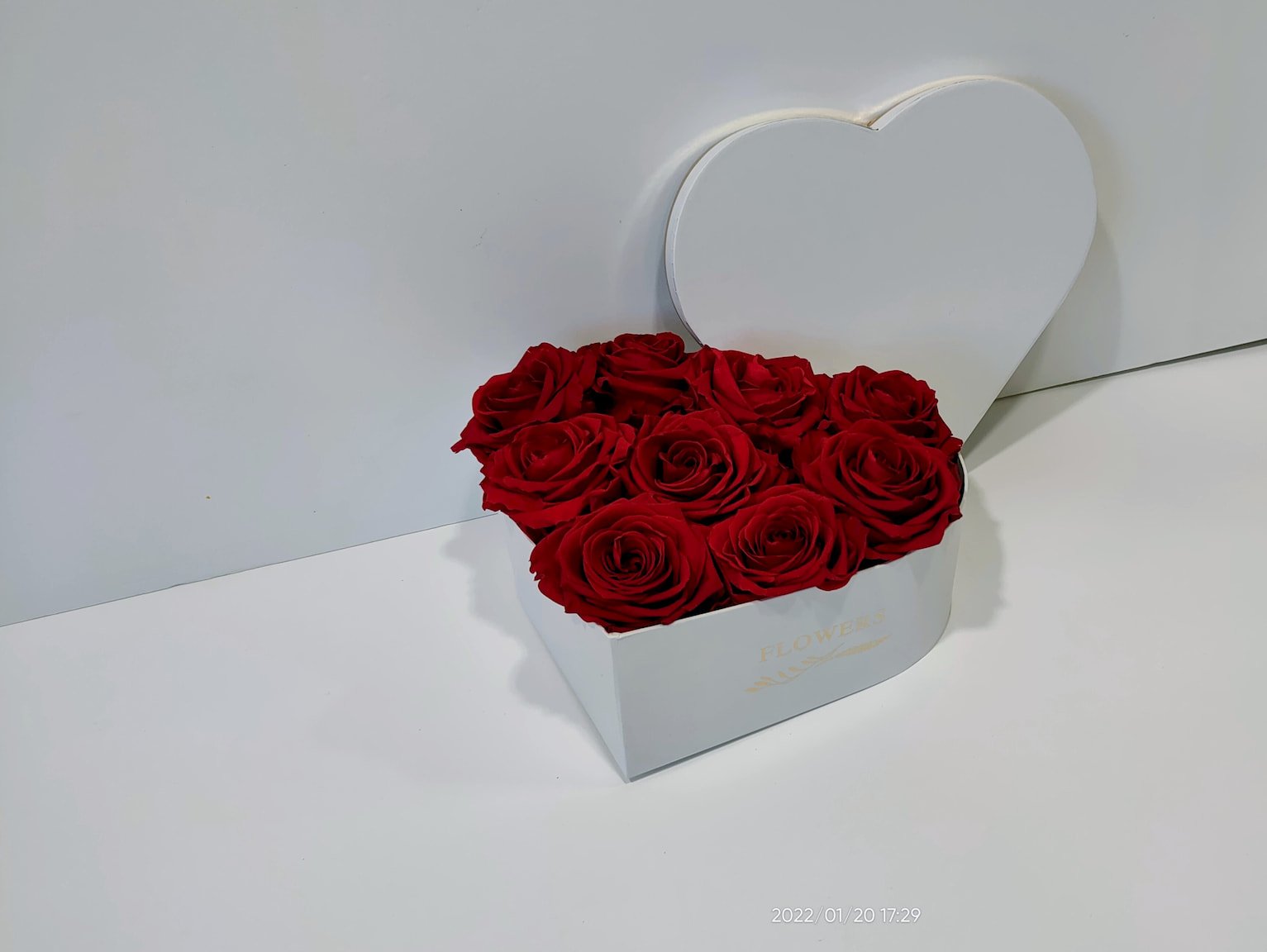 9 Αποχυμωμένα τριαντάφυλλα Εκουαδόρ σε κόκκινο χρώμα τοποθετημένο σε μια εντυπωσιακή λευκή καρδιά.