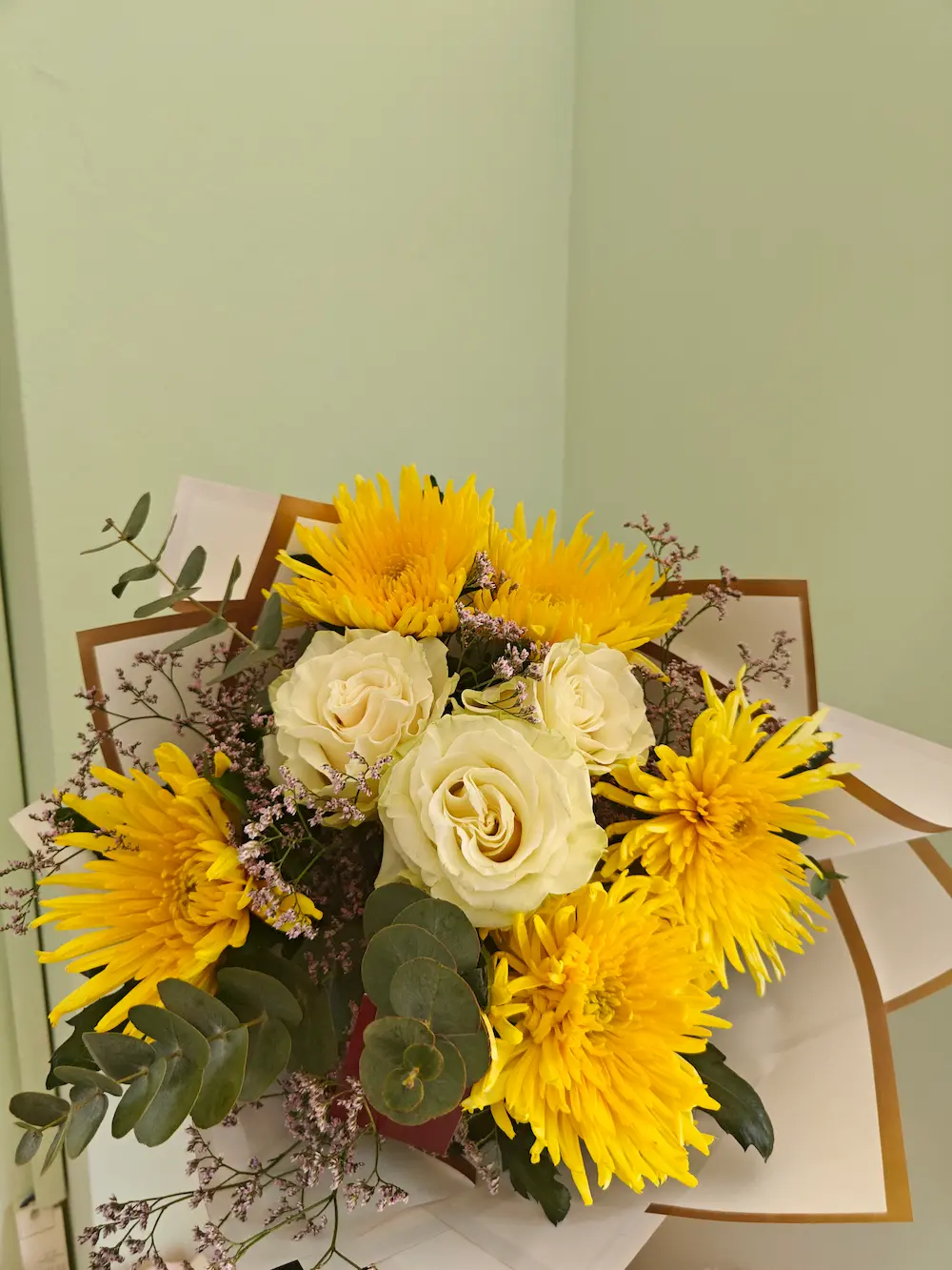 5 καταπληκτικά κίτρινα κεφαλάτα χρυσάνθεμα αγαλλιάζουν 3 ολόλευκα τριαντάφυλλα ecuador δεμένα όλα μαζί με limonium, φύλλα ευκάλυπτου και ένα πλούσιο περιτύλιγμα δημιουργούν ένα πολύ εντυπωσιακό μπουκέτο για κάθε περίσταση.